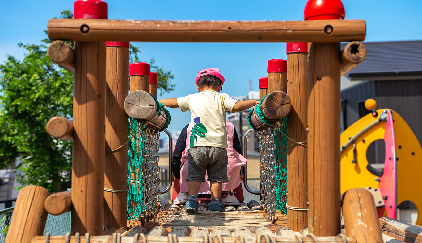 幼稚園と共有の広い園庭で、成長に合わせてのびのび遊ぶことができます。園舎内に設置予定のホールでは、天候に左右されず楽しく遊ぶことができます。